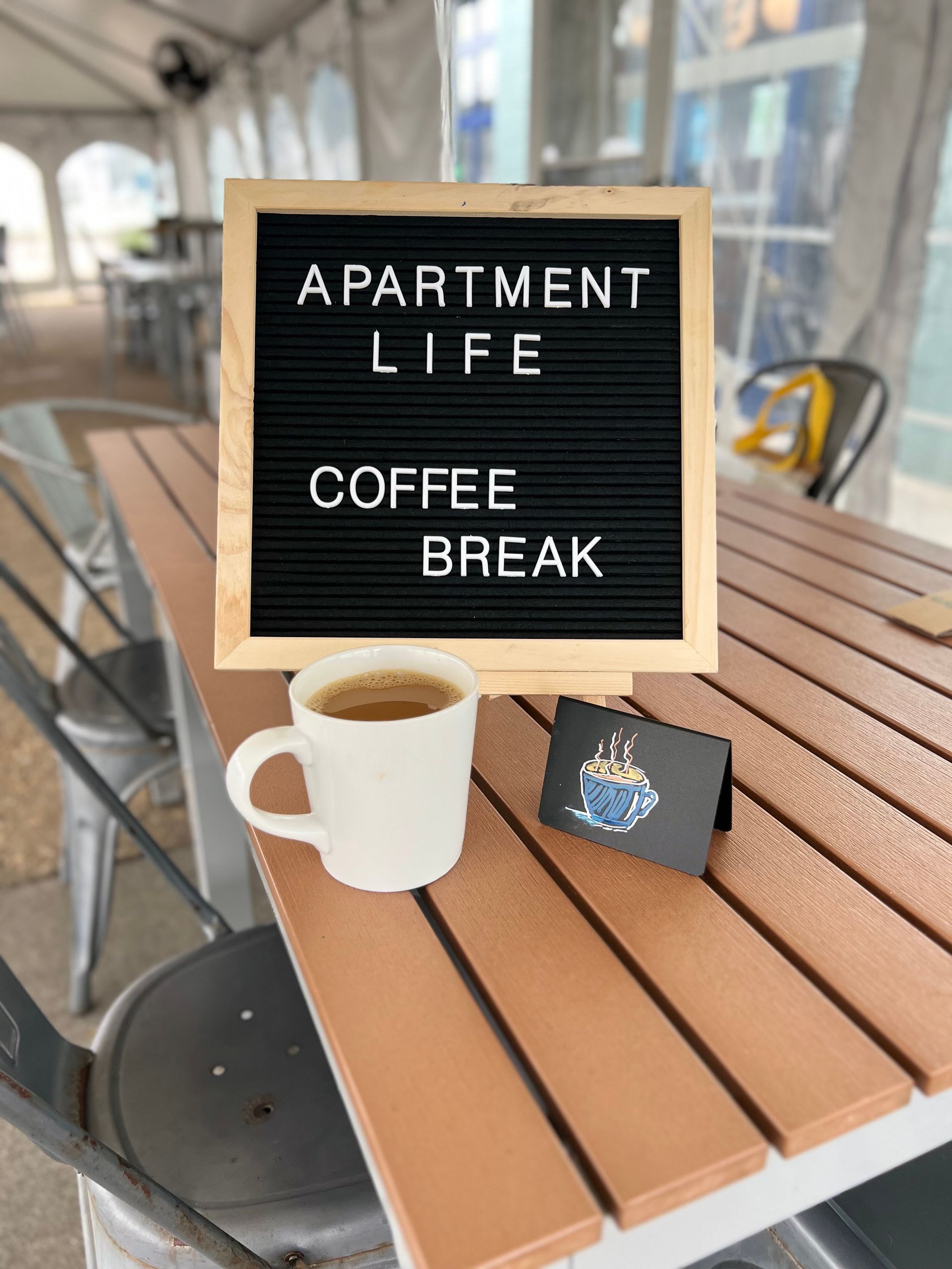 Our Apartment Life team at East Beach hosted a lovely midday coffee break event at Cova Brewery/Coffee last Saturday. The table was beautifully decorated, and we promoted the event on Facebook as well as shared community-invite pictures with our residents. Despite the unfavorable weather, it was a delightful event that energized us all!